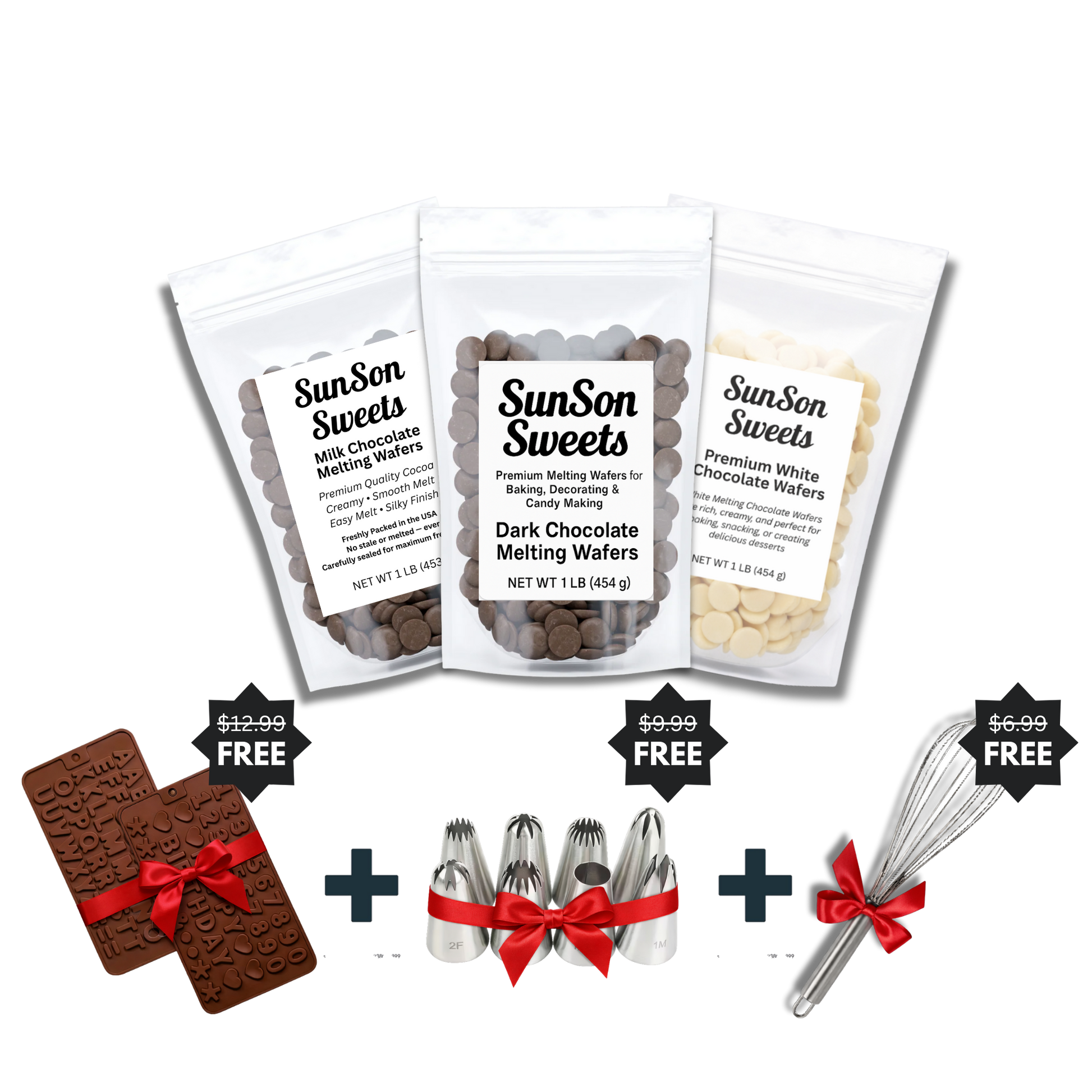 Sunson Sweets is designed specifically for home bakers. Our melting wafers melt smoothly without burning when used as directed, don’t require tempering, and deliver consistent results batch after batch. Most melting chocolate is made for commercial use — ours is made for real kitchens.